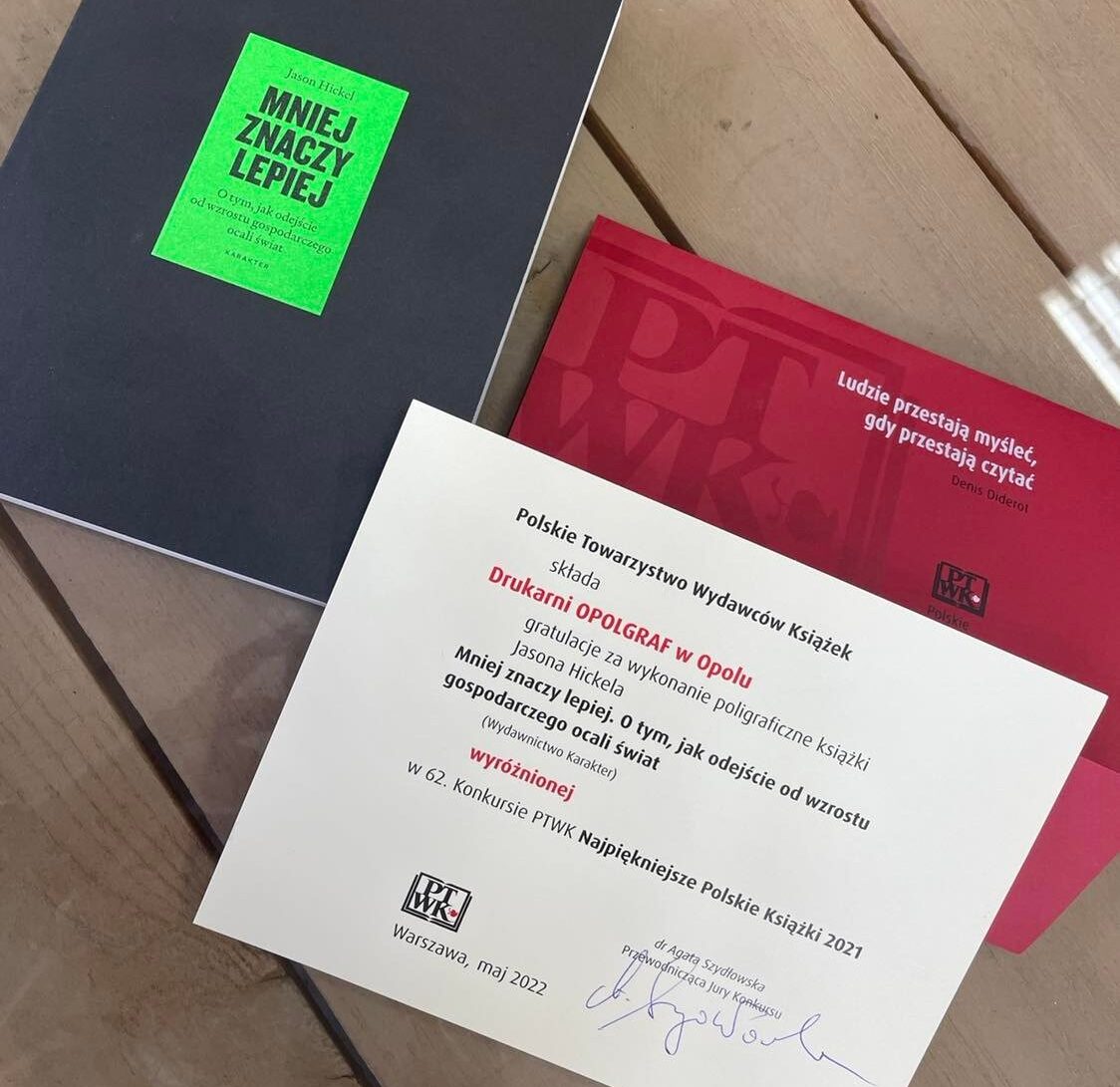 We received congratulations from the Polish Society of Book Publishers for the production of a book by Jason Hickel entitled “Less is better. How moving away from economic growth will save the world.” Karakter Publishing House. This book was awarded in the 62nd PTWK Most Beautiful Polish Books 2021 Competition.